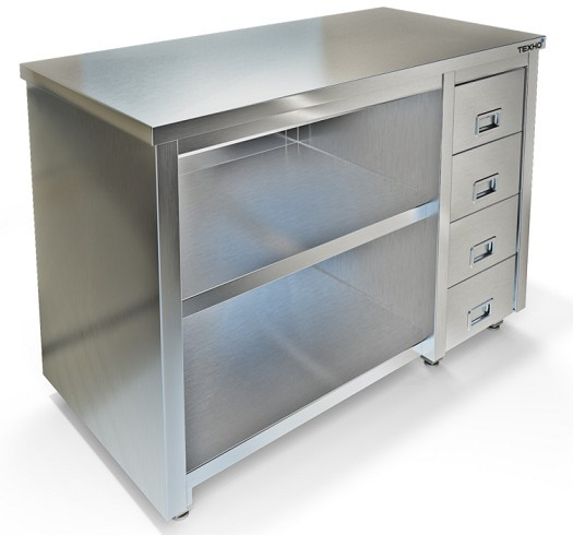 800х600х850мм, Стол-тумба без дверей без борта. Столешница из нержавеющей стали марки AISI 430 толщиной 0,8мм, ЛДСП толщиной 32 мм. Корпус, полка и четыре выдвижных ящика расположенных справа изготовлены из нержавеющей стали марки AISI 430 толщиной 0,8мм. Задняя стенка из оцинкованной стали толщиной 0,55мм. Регулируемые опоры. Стол поставляется в собранном виде.